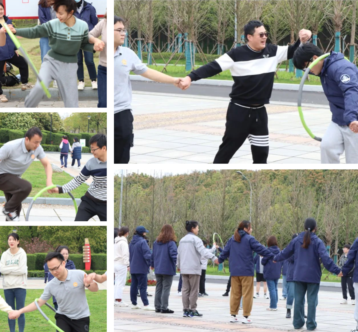 每個小組組員手牽手站成一圈傳遞呼啦圈,牽著的手全程不能松開,不能用手去扶呼啦圈,只能靠身體的靈活性去把呼啦圈傳遞給下一個隊友,這個時候不僅僅是速度和身材,還有團(tuán)隊的協(xié)作力。